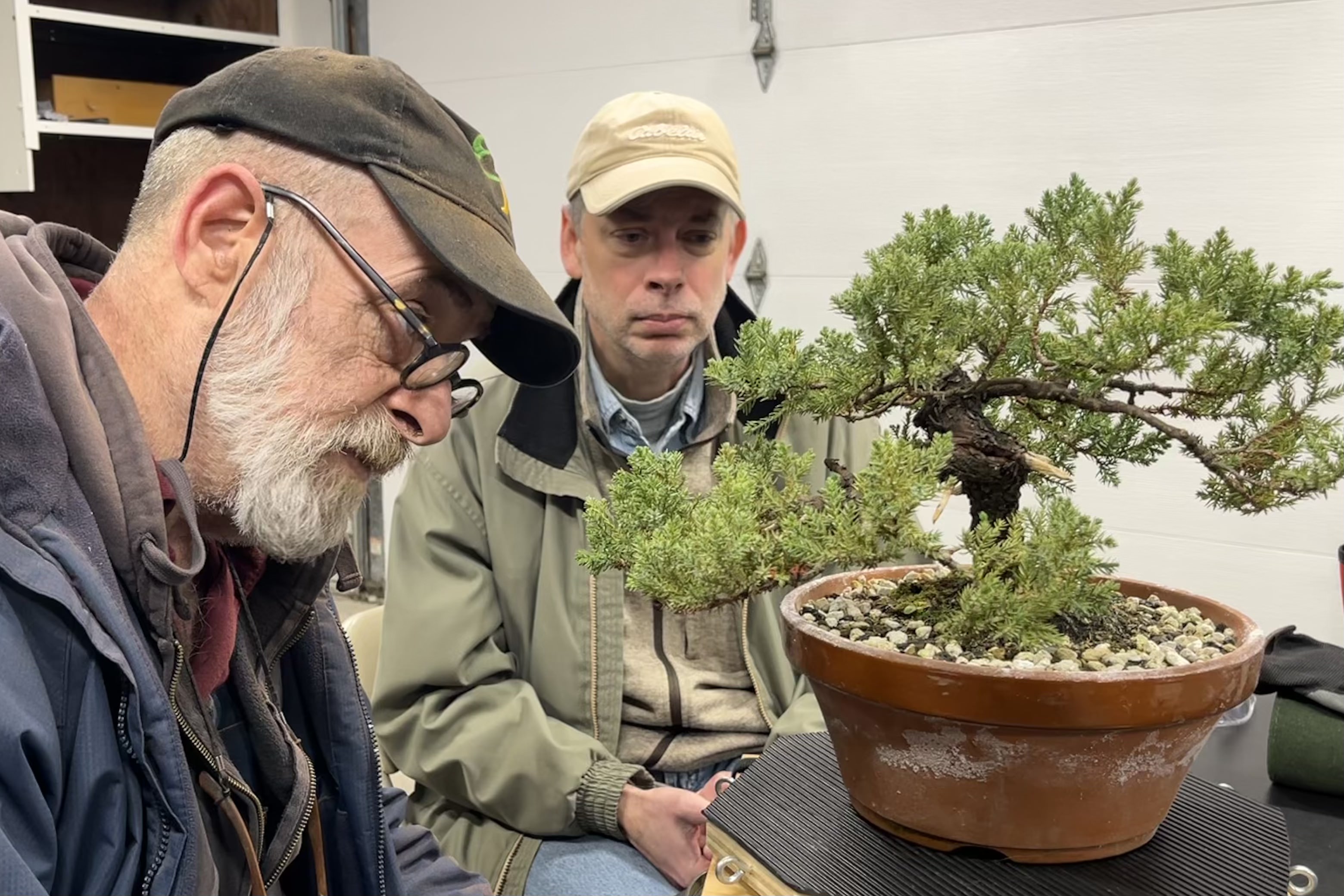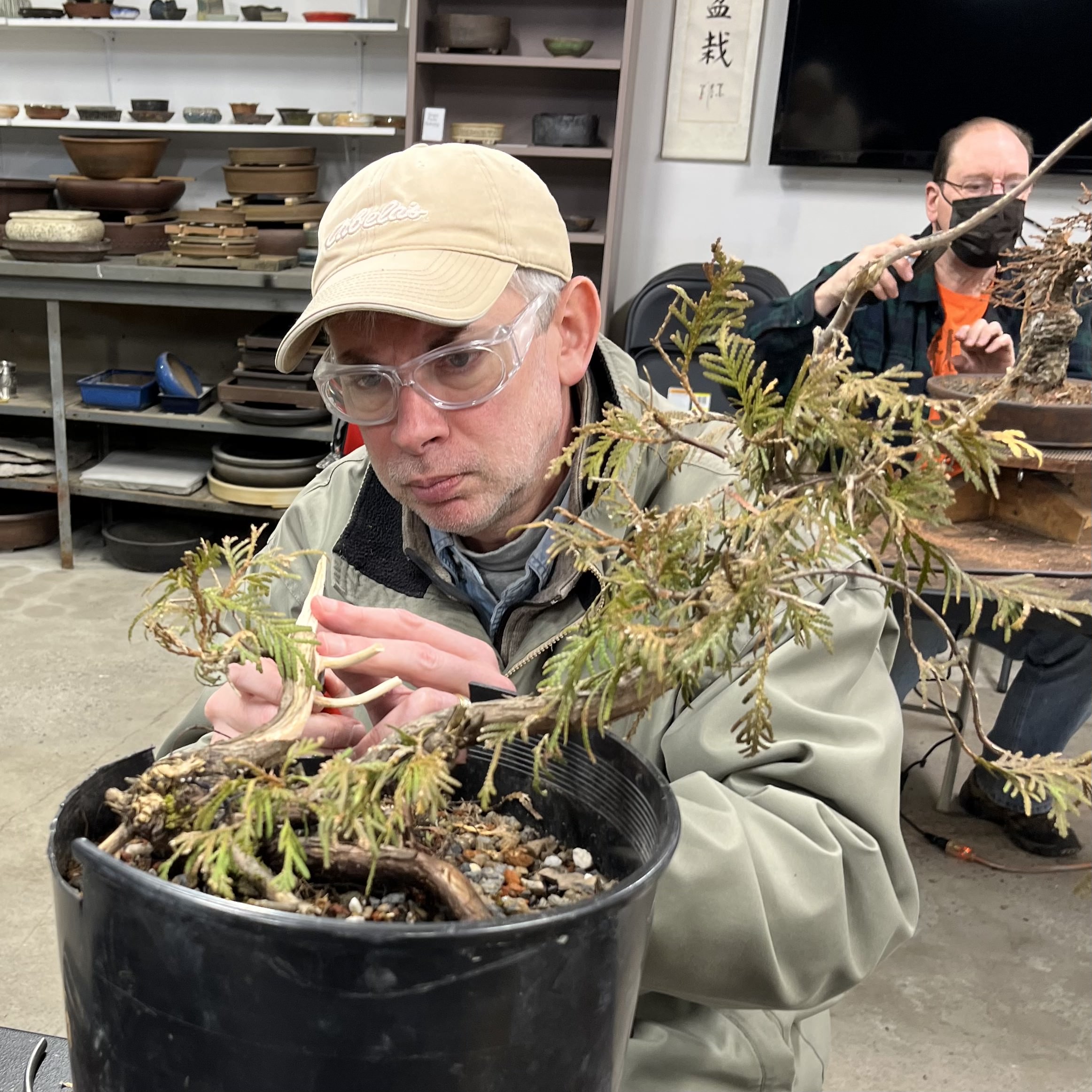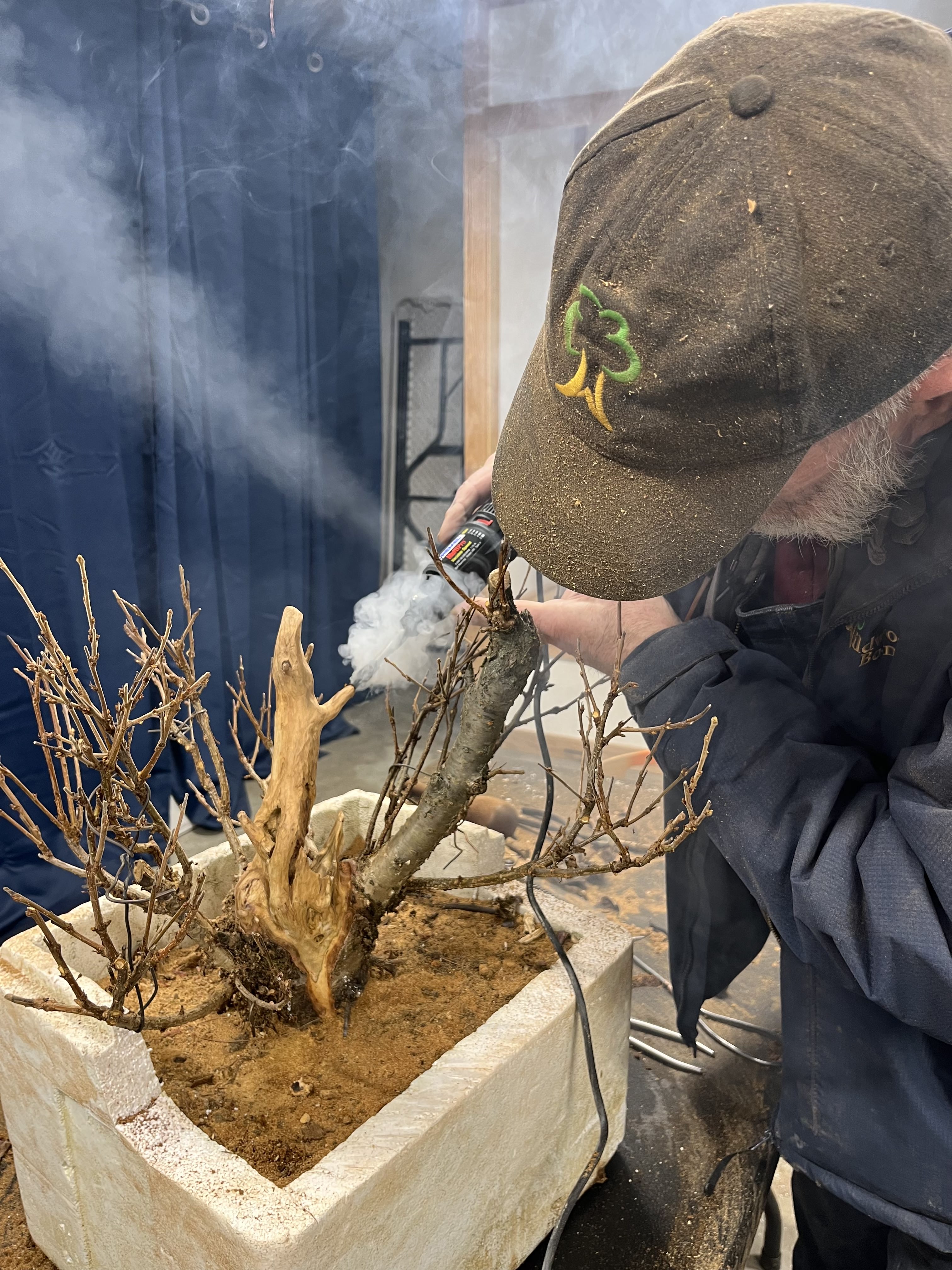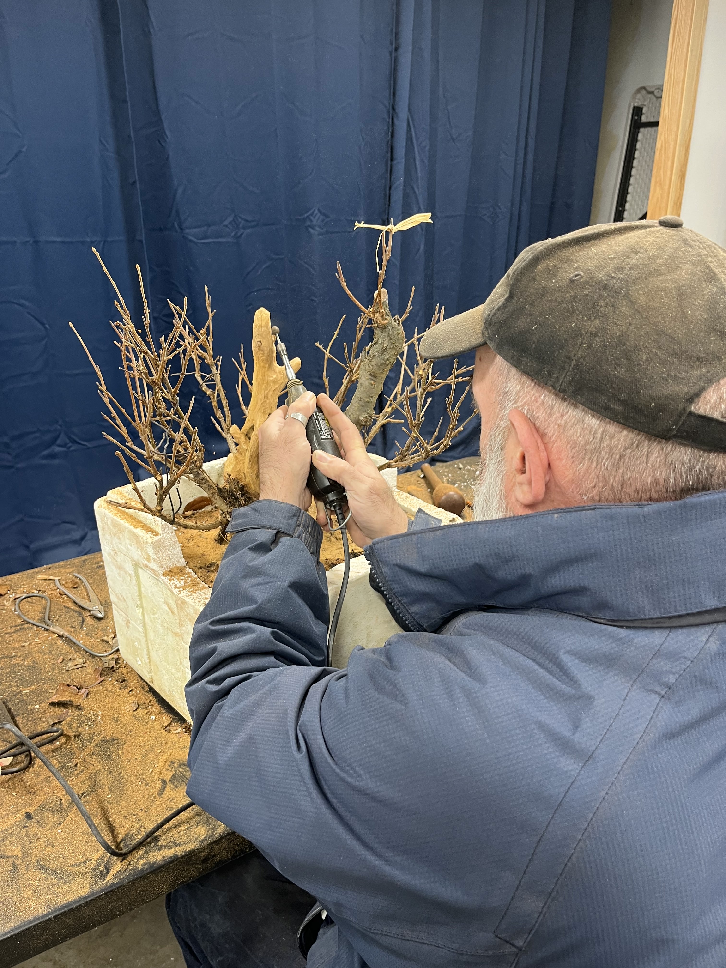 On Saturday, before the club meeting, Mr. Baddeley worked on individual trees with several club members during a one-on-one workshop. On Sunday he brought his craft and experience to an arborvitae provided by DJH Bonsai for the demonstration – a large lower horizontal branch was deemed too distracting to the final design and therefore removed and transformed into beautiful deadwood by the artist, who gave us all carving pointers along the way.