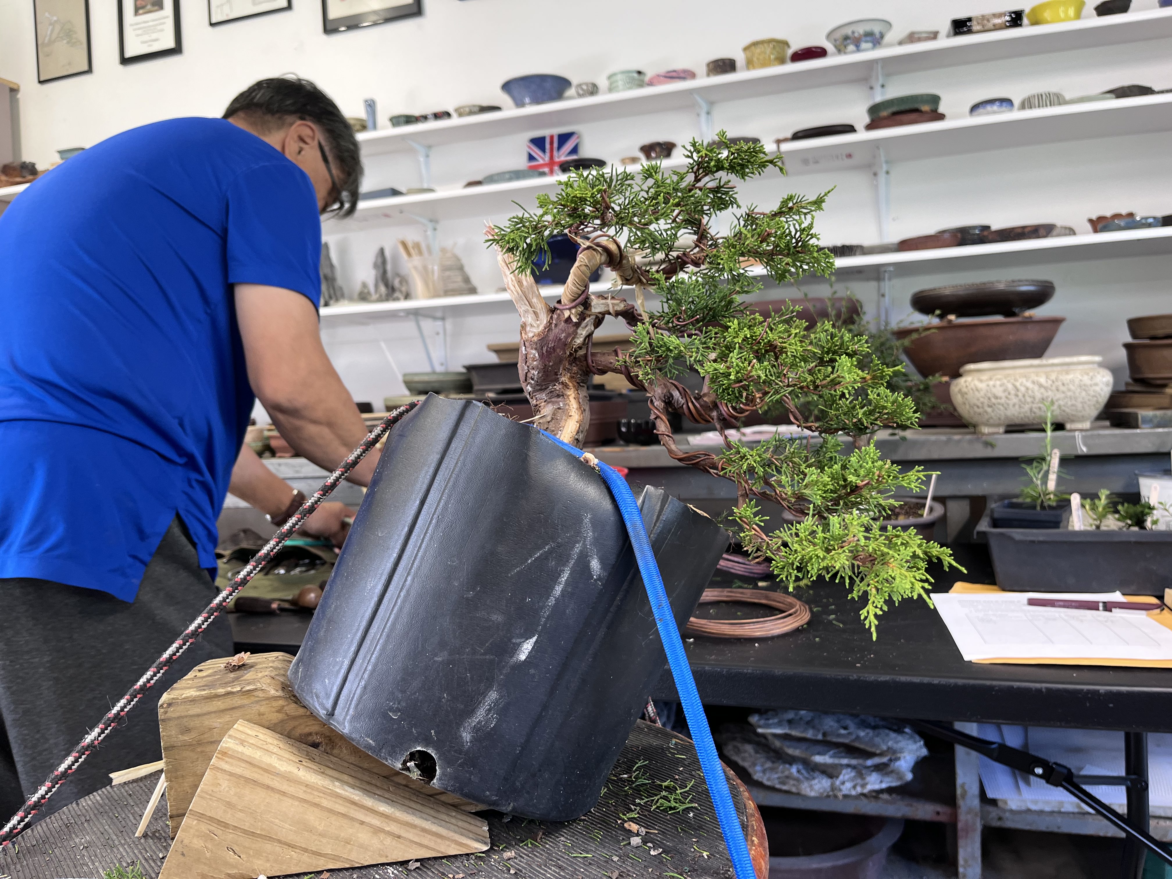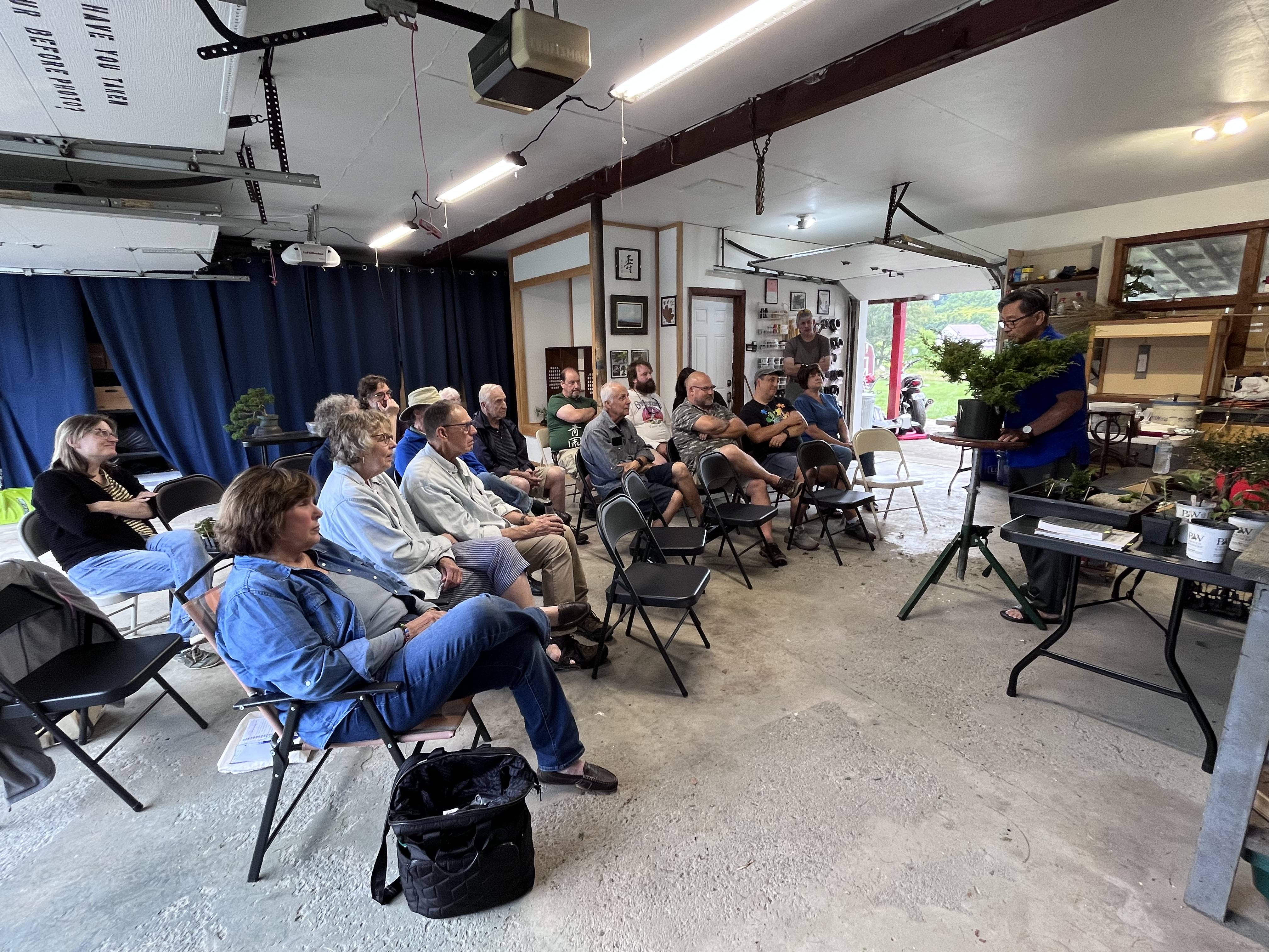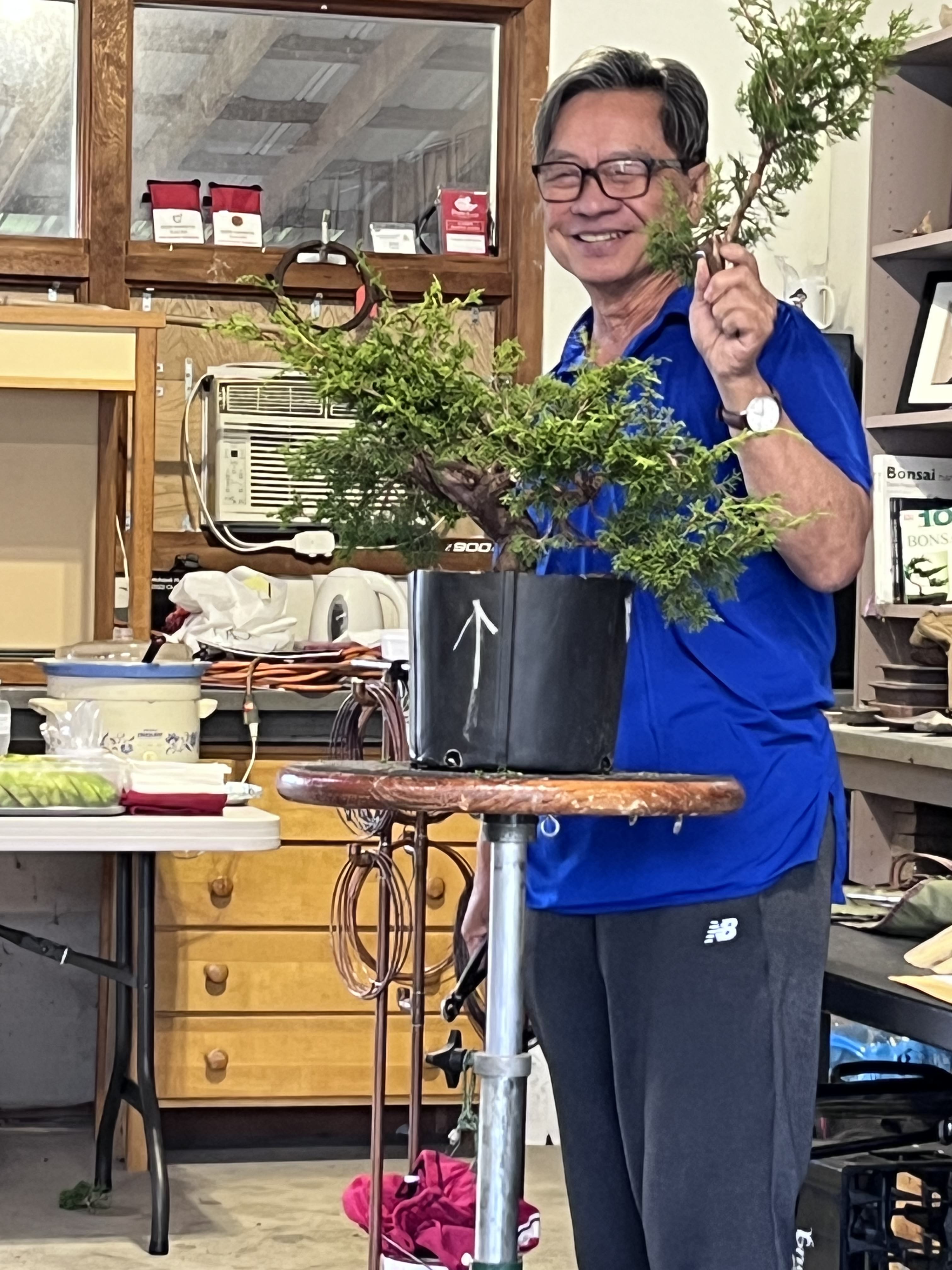 attendees as he works. Suthin worked on an Itoigawa Juniper, reducing it substantially to create a wonderful tree for its new owner, Jon Staples, who won it in our raffle.