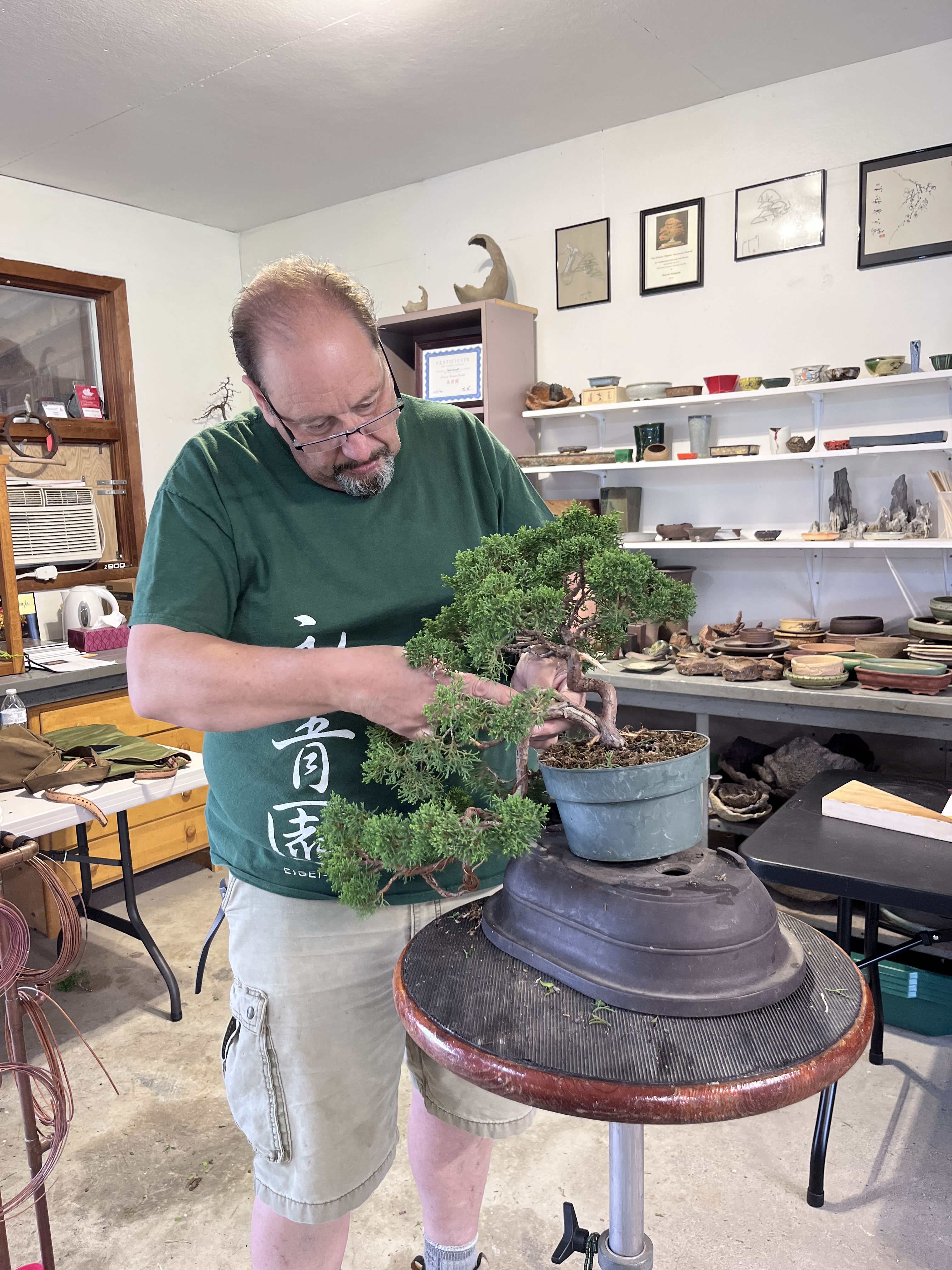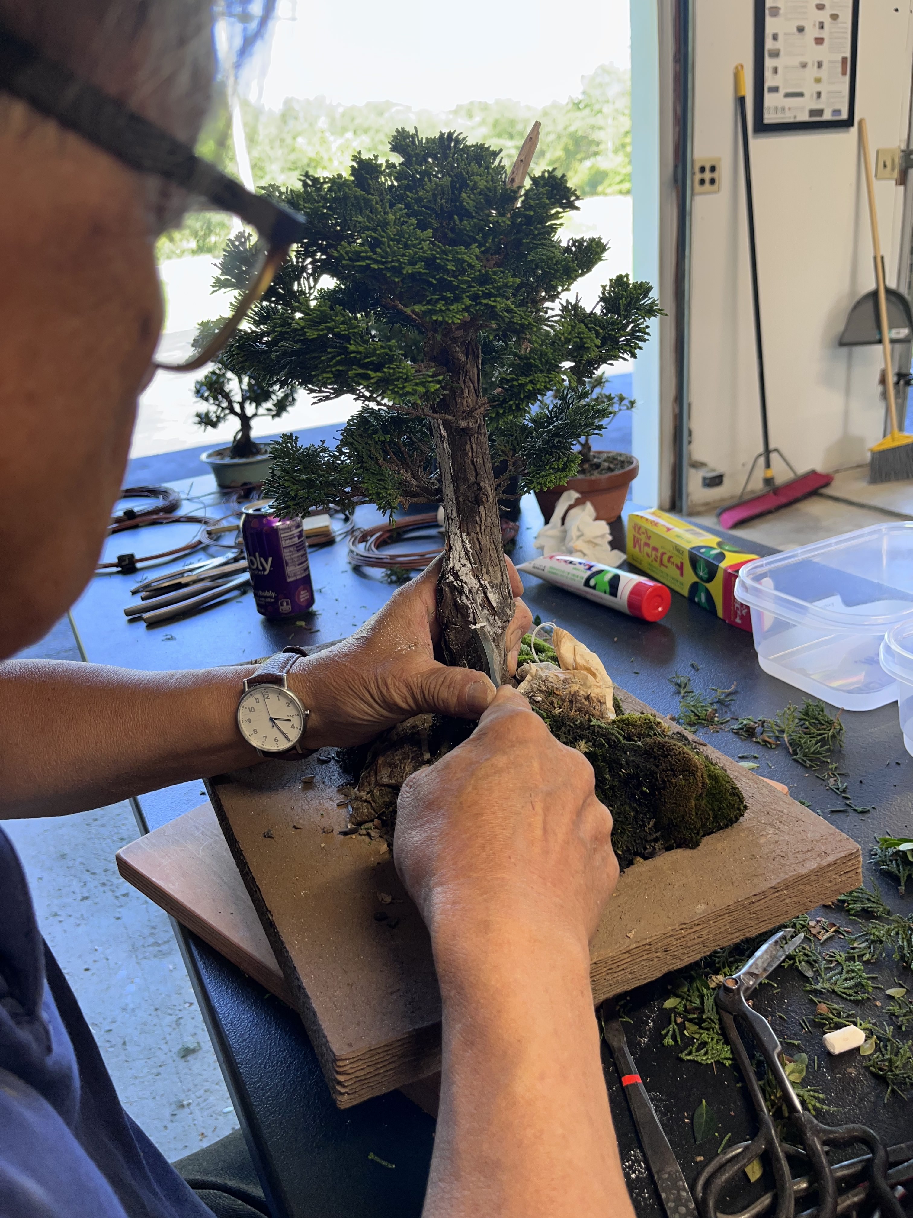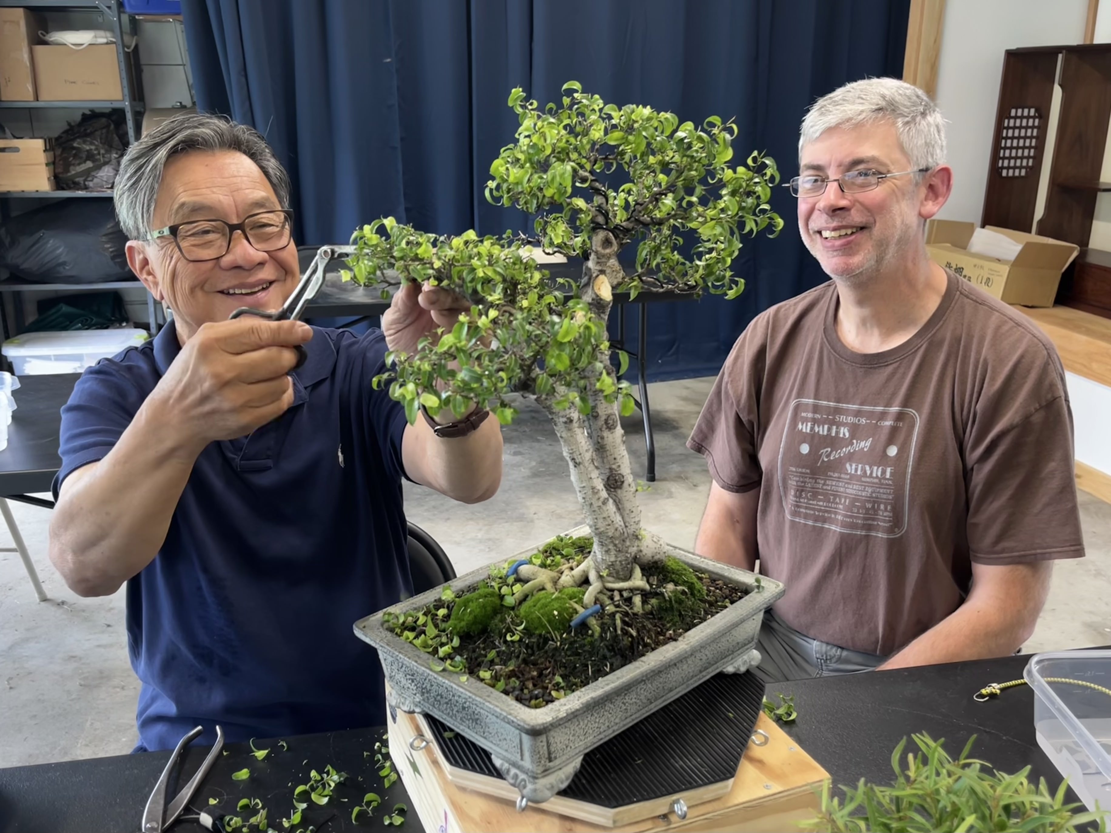 He started each workshop by discussing a tree brought by each participant, allowing us to hear his thinking and suggestions on a nice variety of trees. Most participants brought trees to look for guidance on major design decisions, something Suthin excels at. And he is not afraid to cut (with permission, of course!!). There were many dramatic transformations as our trees took shape under Suthin’s watchful eye.