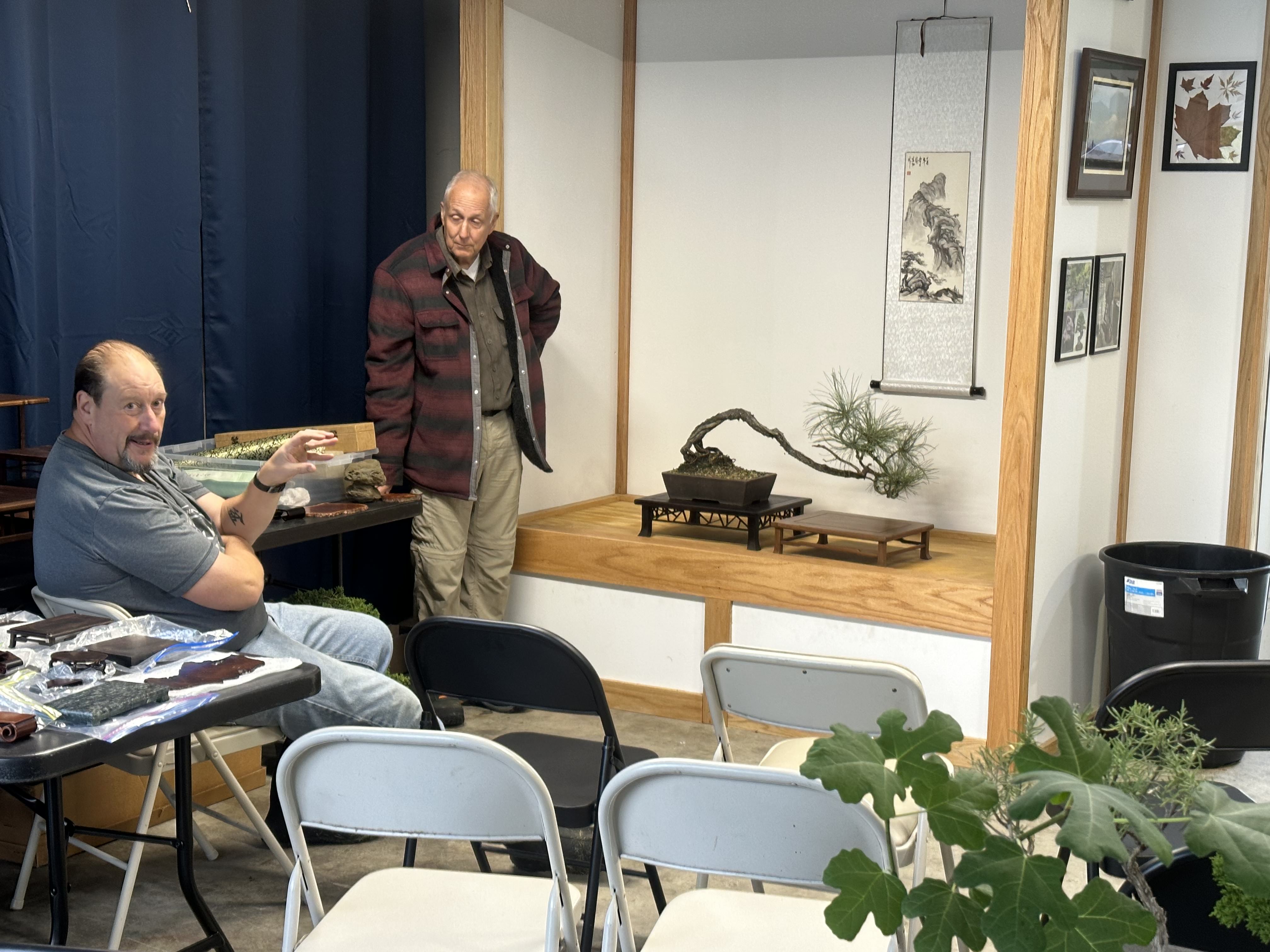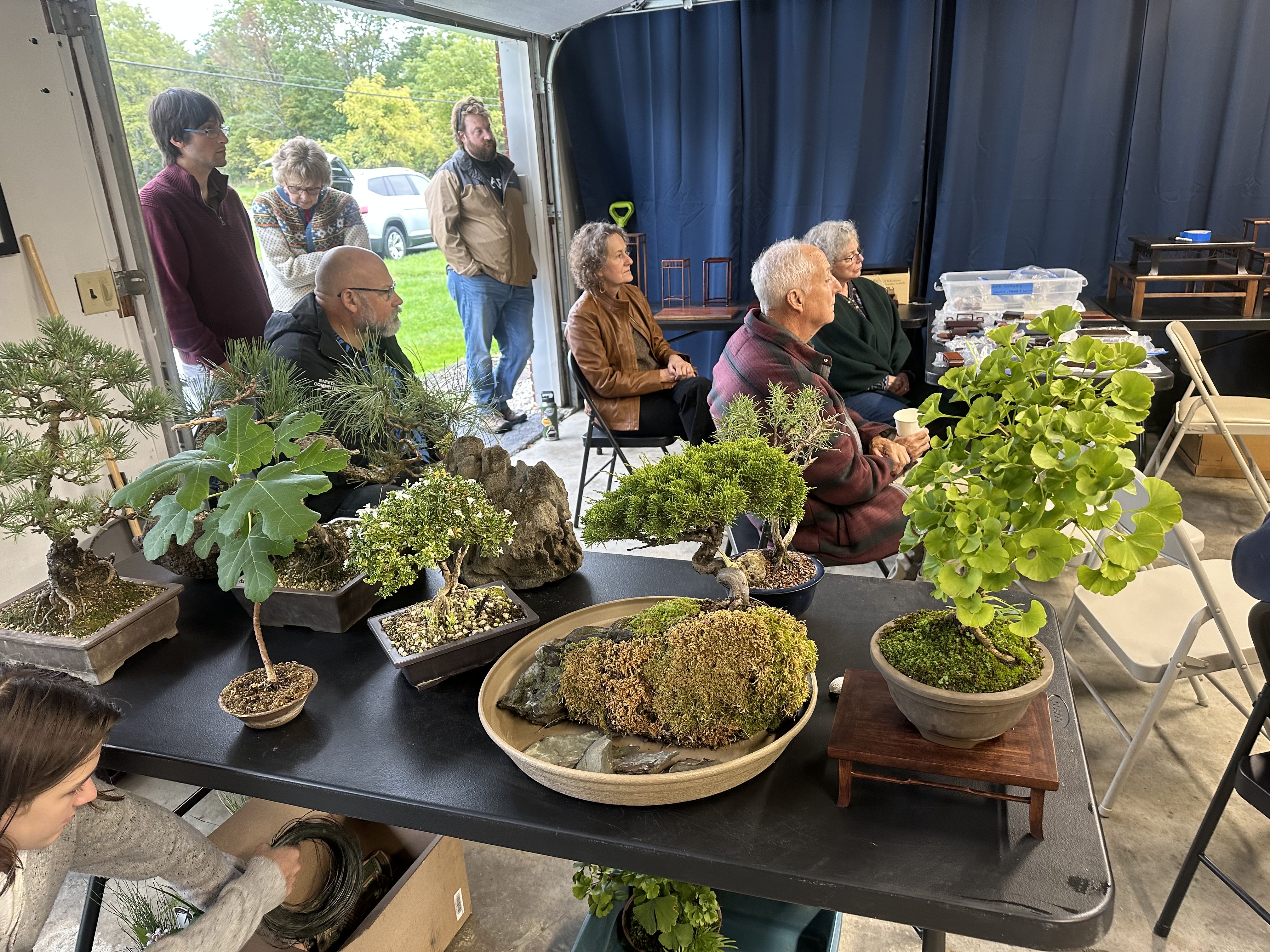 Members assembled at DJH Bonsai in Feura Bush with a wide variety of trees, stands, and accents to put together displays for the upcoming club show and to give and get advice on displays.