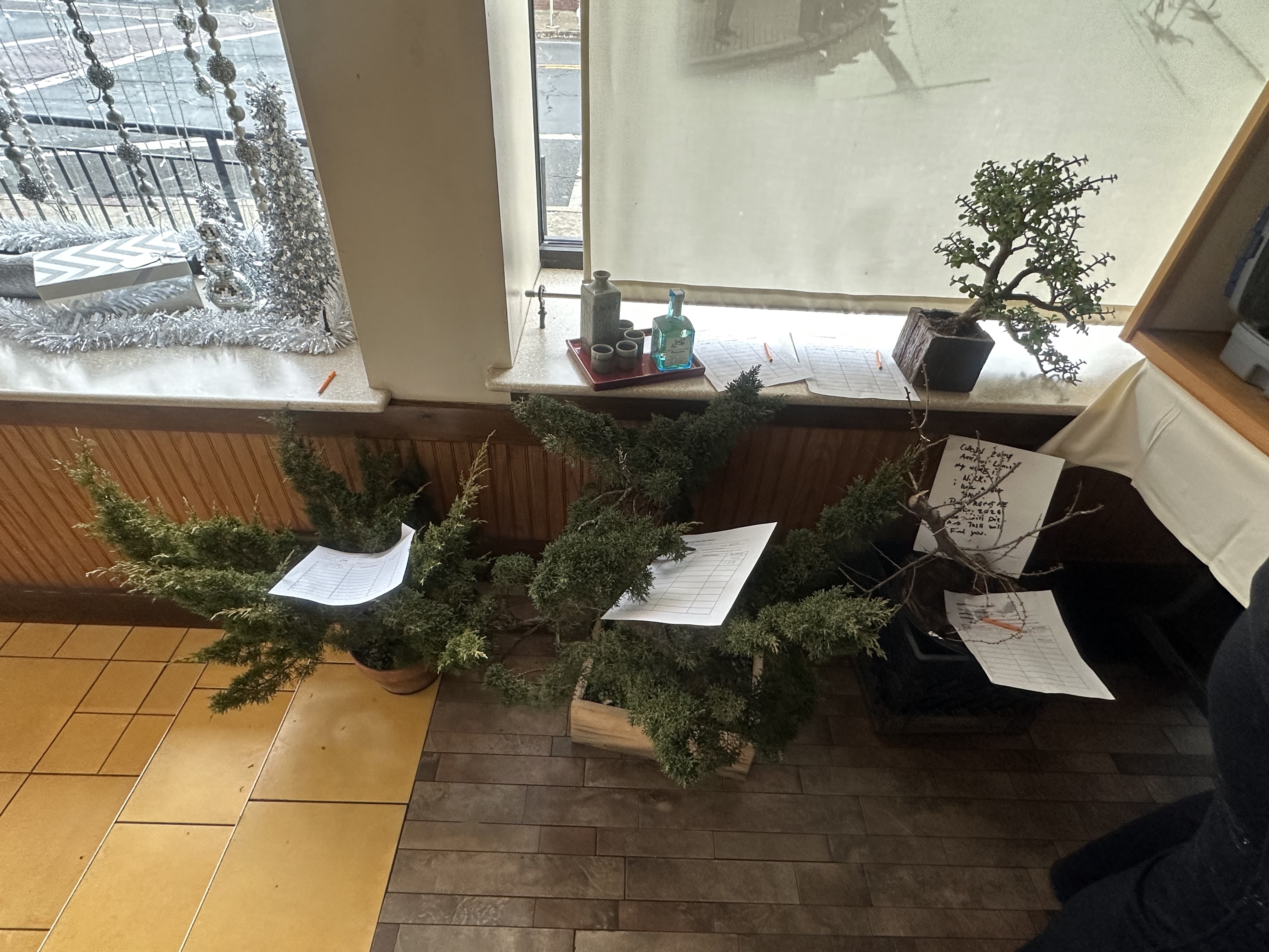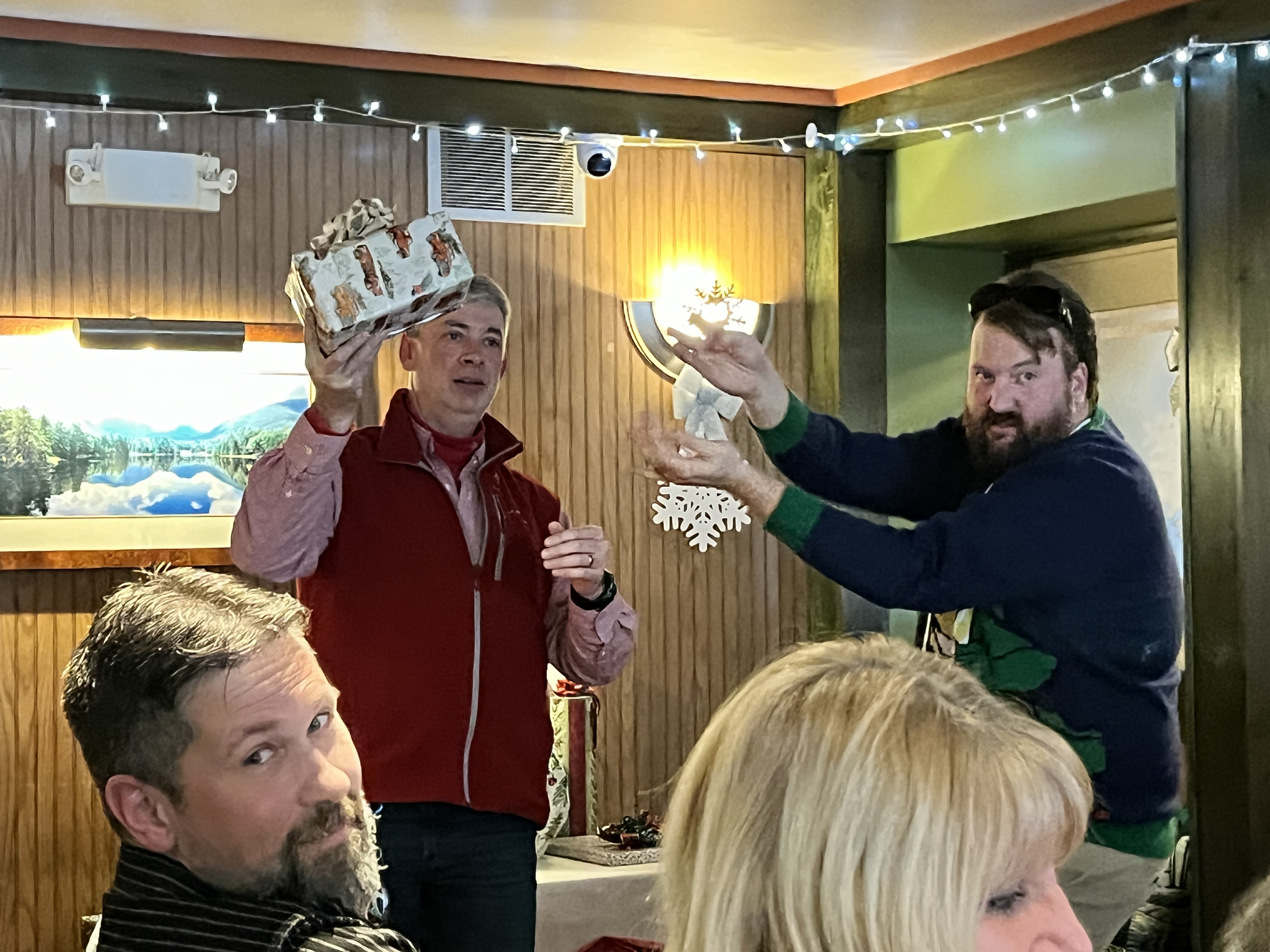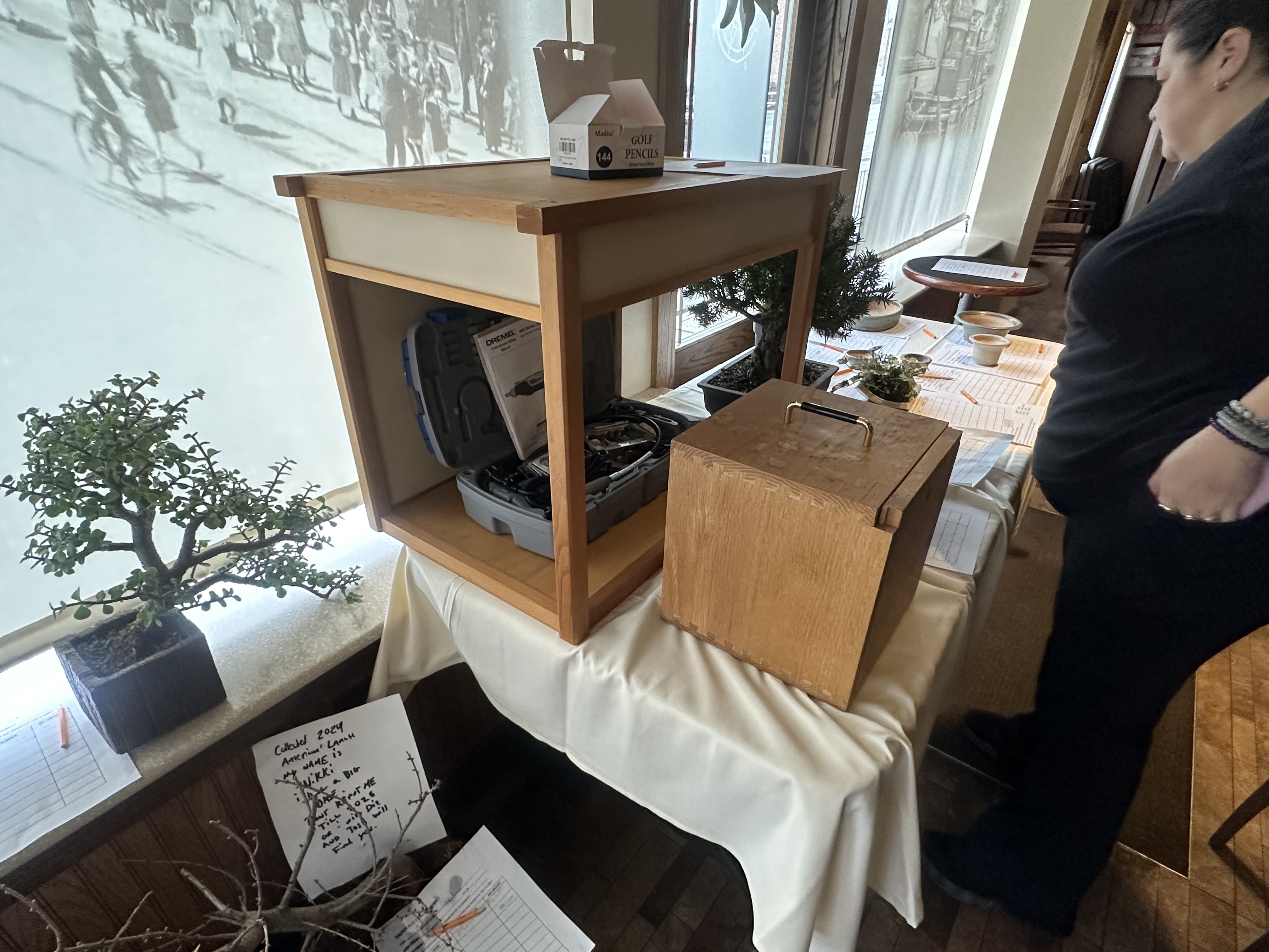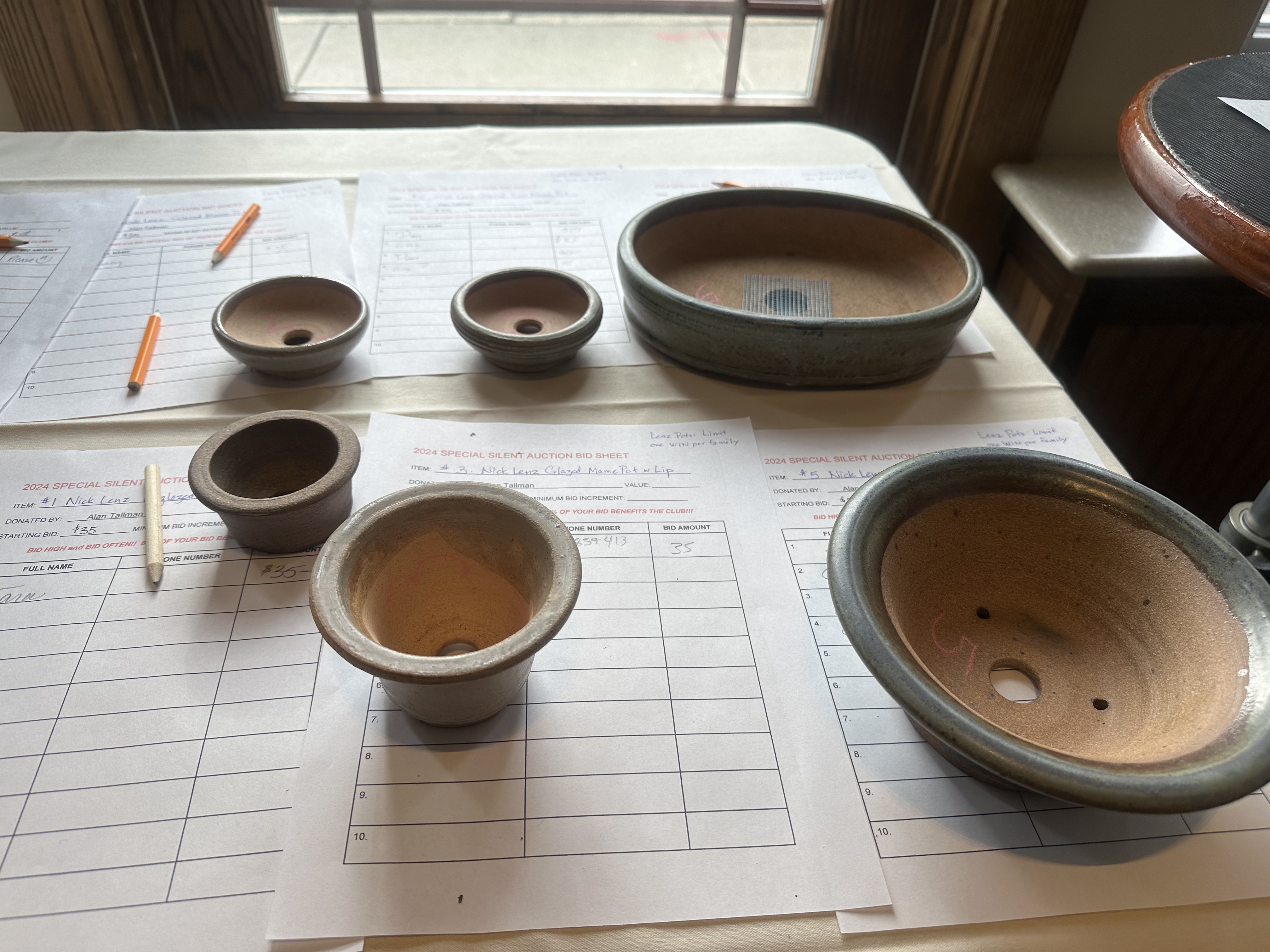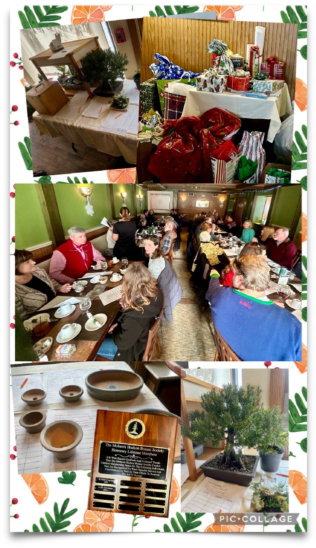 In addition to being a good time, our holiday party is a significant fundraising event for the club. The traditional mystery auction as well as a silent auction of pots, trees, and other items was held and raised $2,363 for future club activities! Our silent auction also featured a number of items donated by Alan Tallman, including six Nick Lenz pots, a tokanoma, a turntable stand and more. Many thanks to Bill Papura and Jon Stewart for an excellent job working the auctioneer’s block.