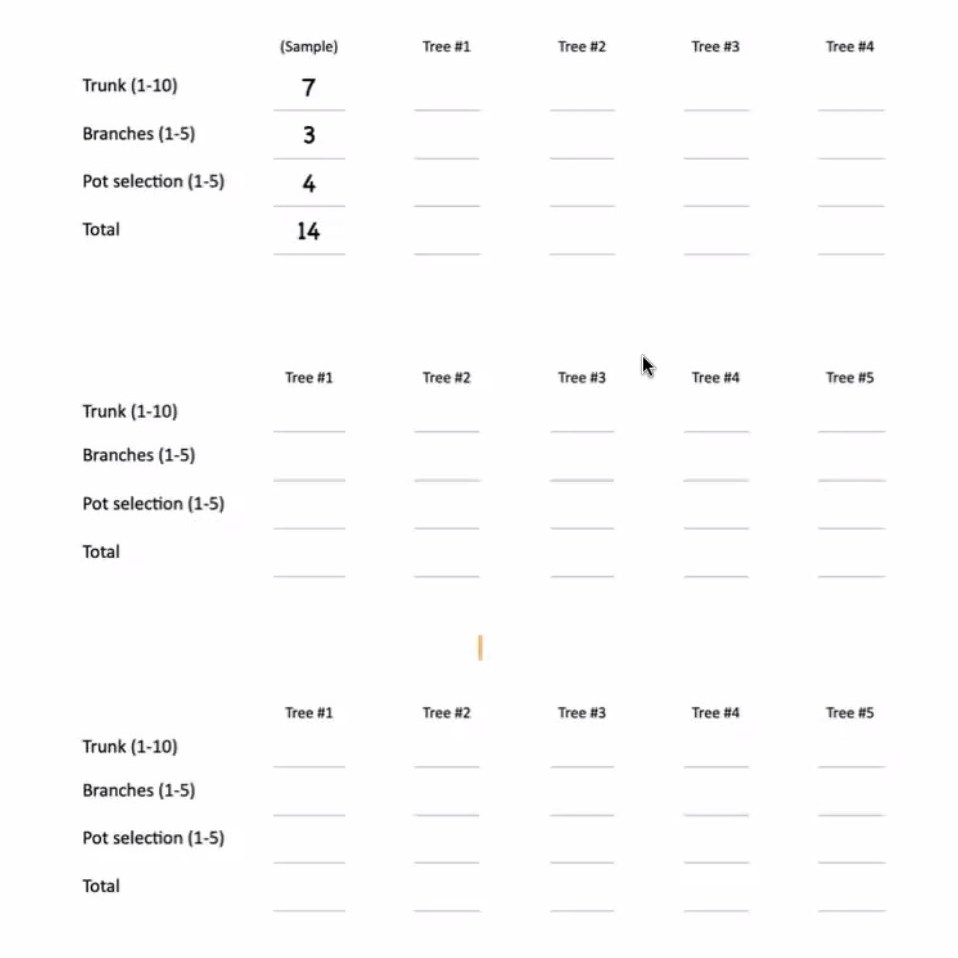 He went over several forms he’s seen used at international shows and in his local bonsai club and we hope this may help prompt and structure tree assessments at meetings in the future for the MHBS. Some examples from his excellent talk are included below.