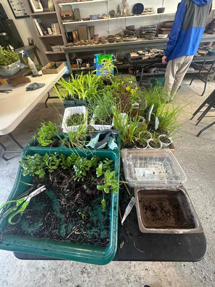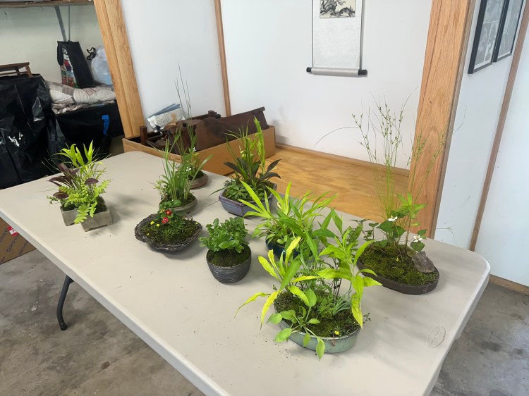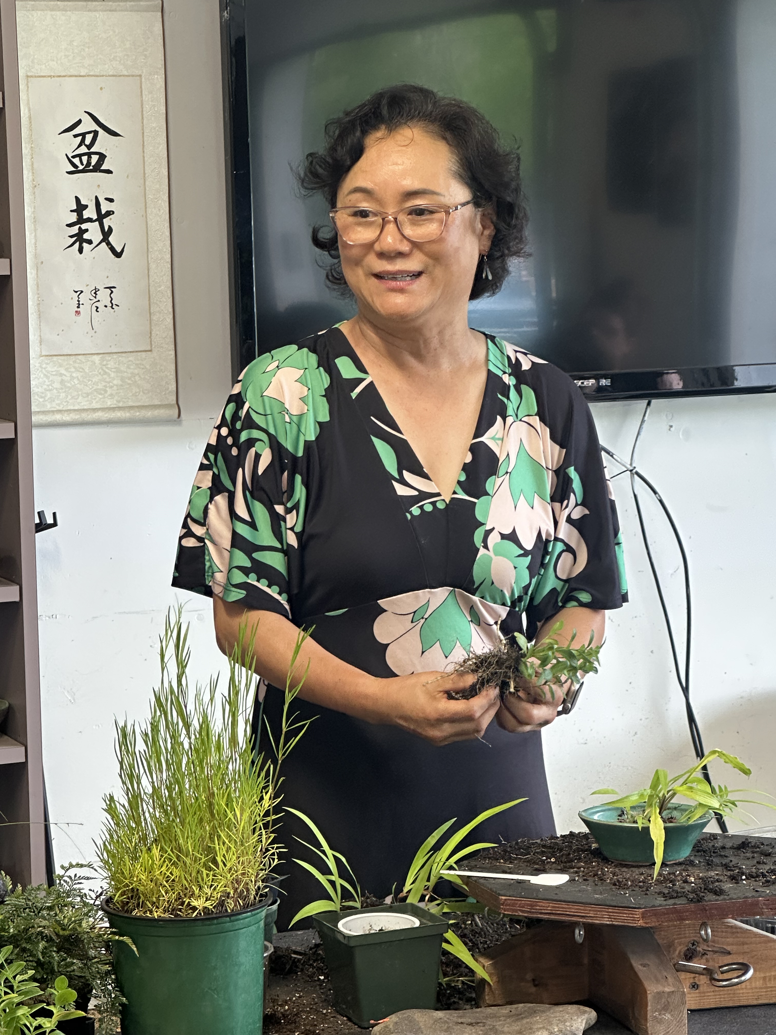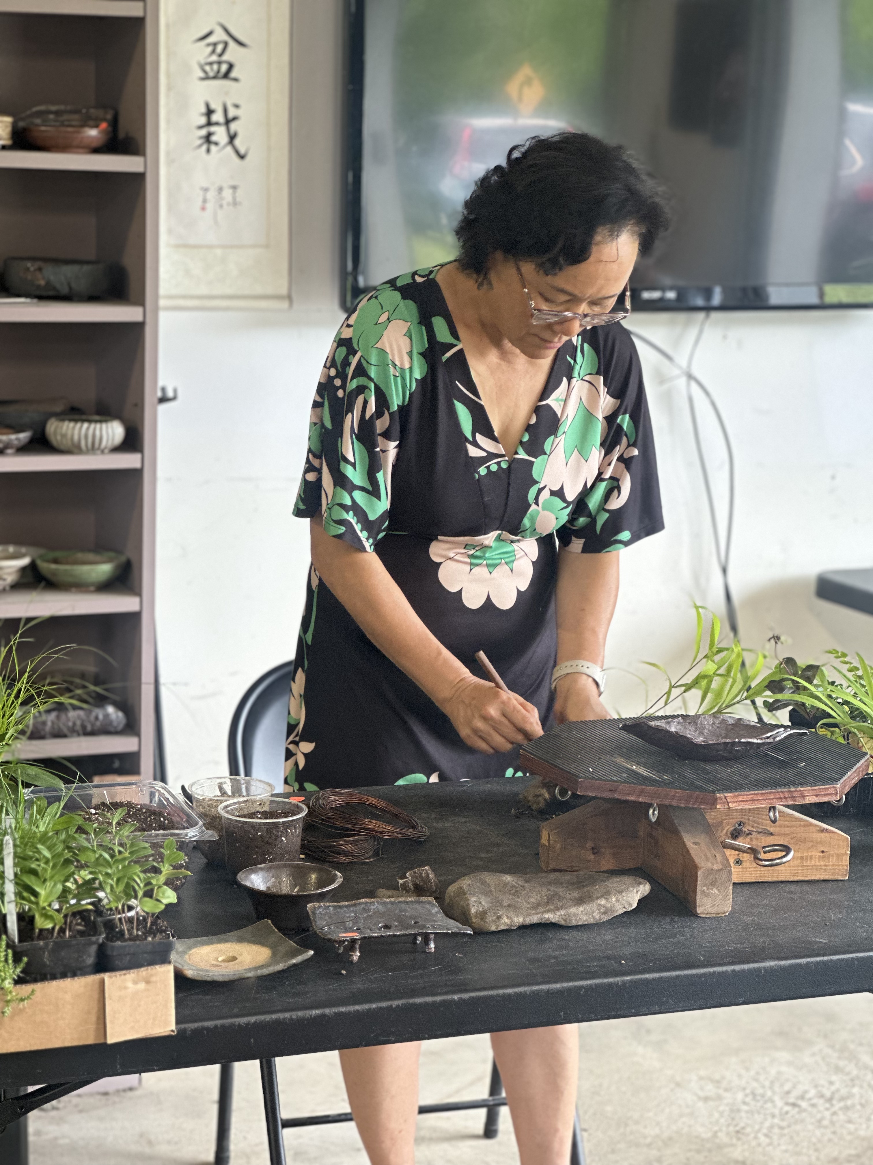 Young gave tips, teaching, and doses of humor in between working with each of the workshop registrants. She spoke about types of plants selected for kusamono, soil, moss, and plant care. A special thank you to Dave and Lori Hodgetts and DJH Bonsai for hosting and to Tom and Sandy Kiszkiel for providing material and kind, experienced help as well!