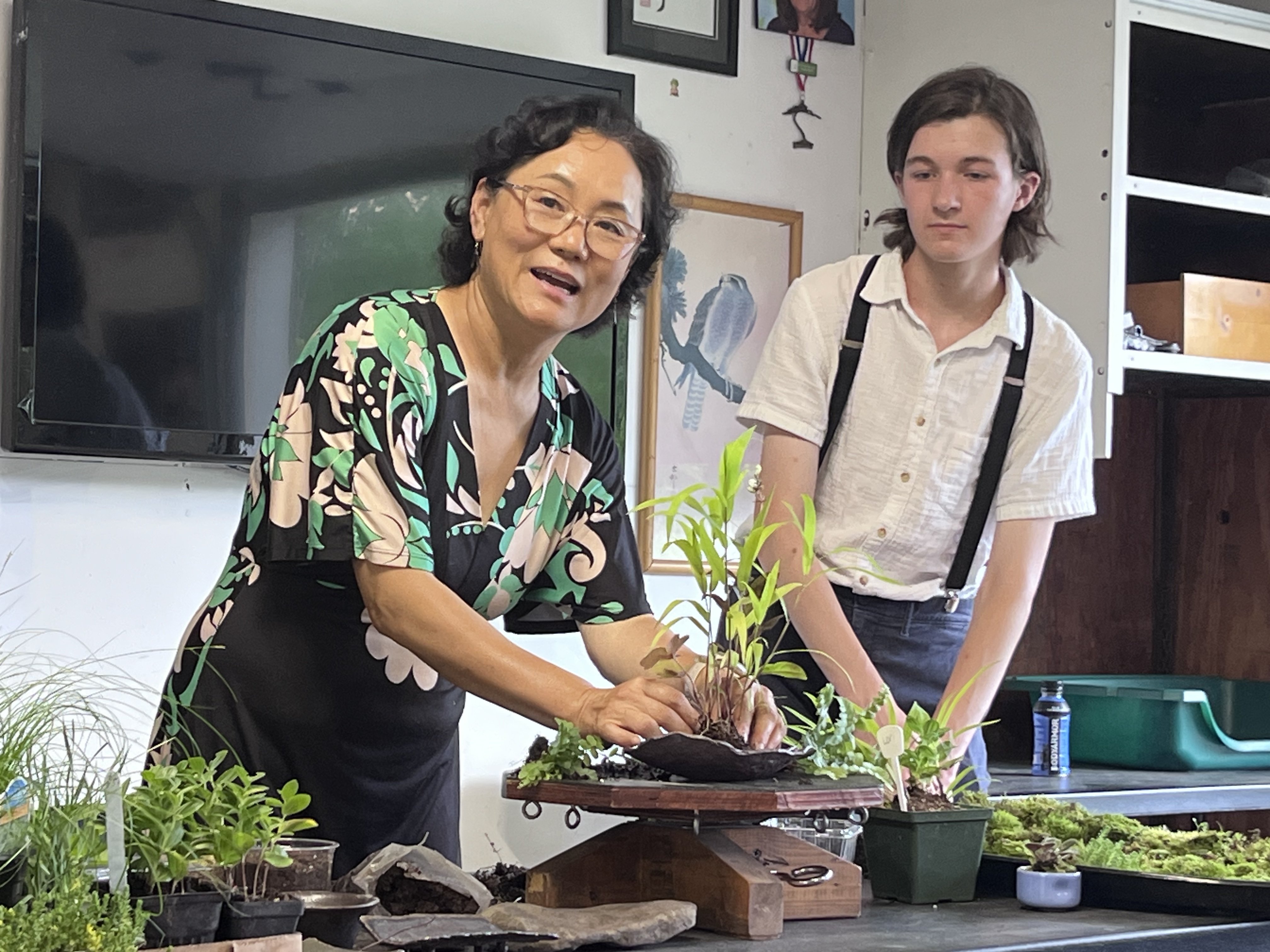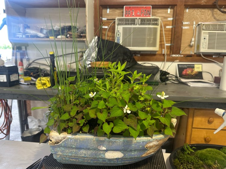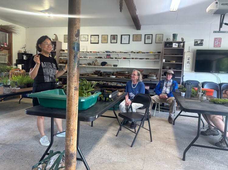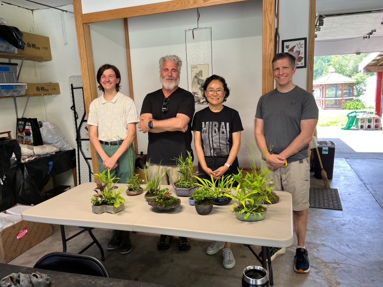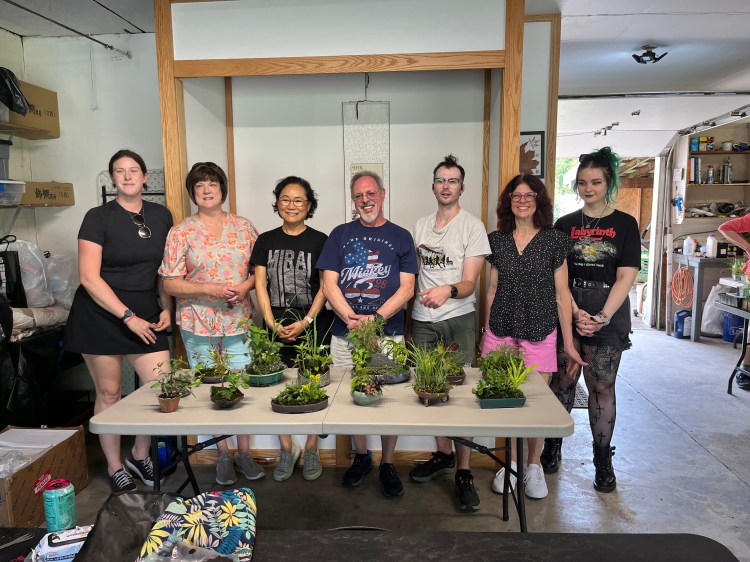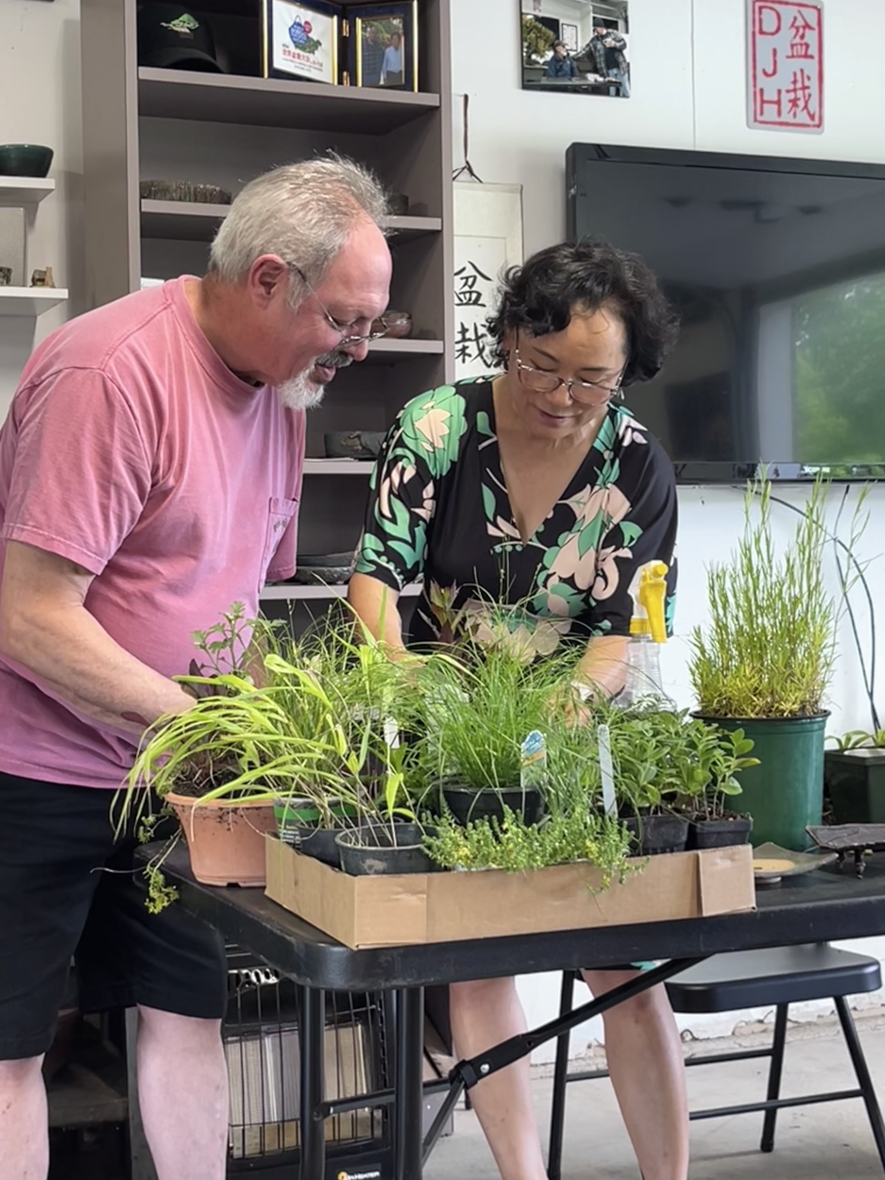 Young gave tips, teaching, and doses of humor in between working with each of the workshop registrants. She spoke about types of plants selected for kusamono, soil, moss, and plant care. A special thank you to Dave and Lori Hodgetts and DJH Bonsai for hosting and to Tom and Sandy Kiszkiel for providing material and kind, experienced help as well!
