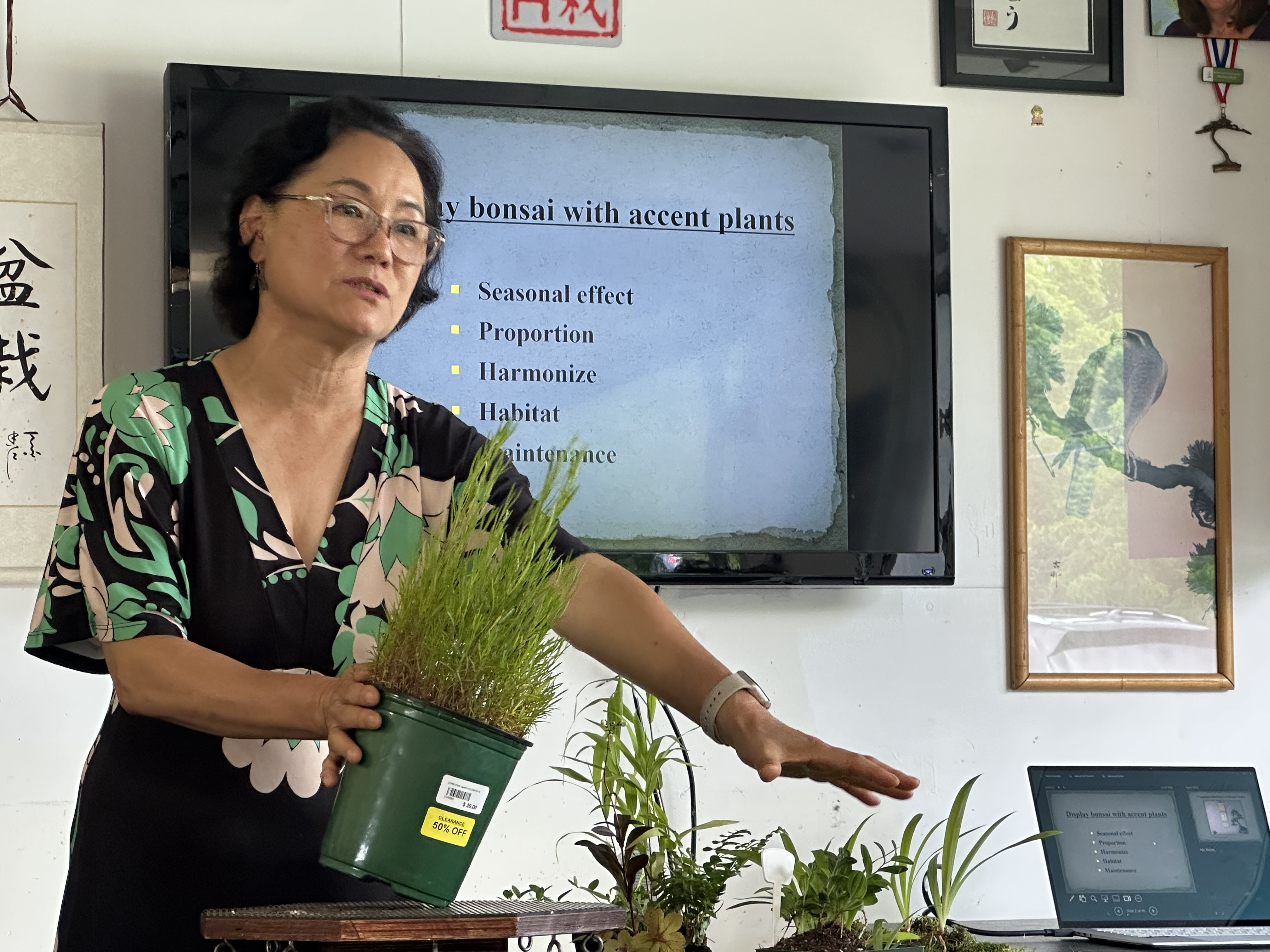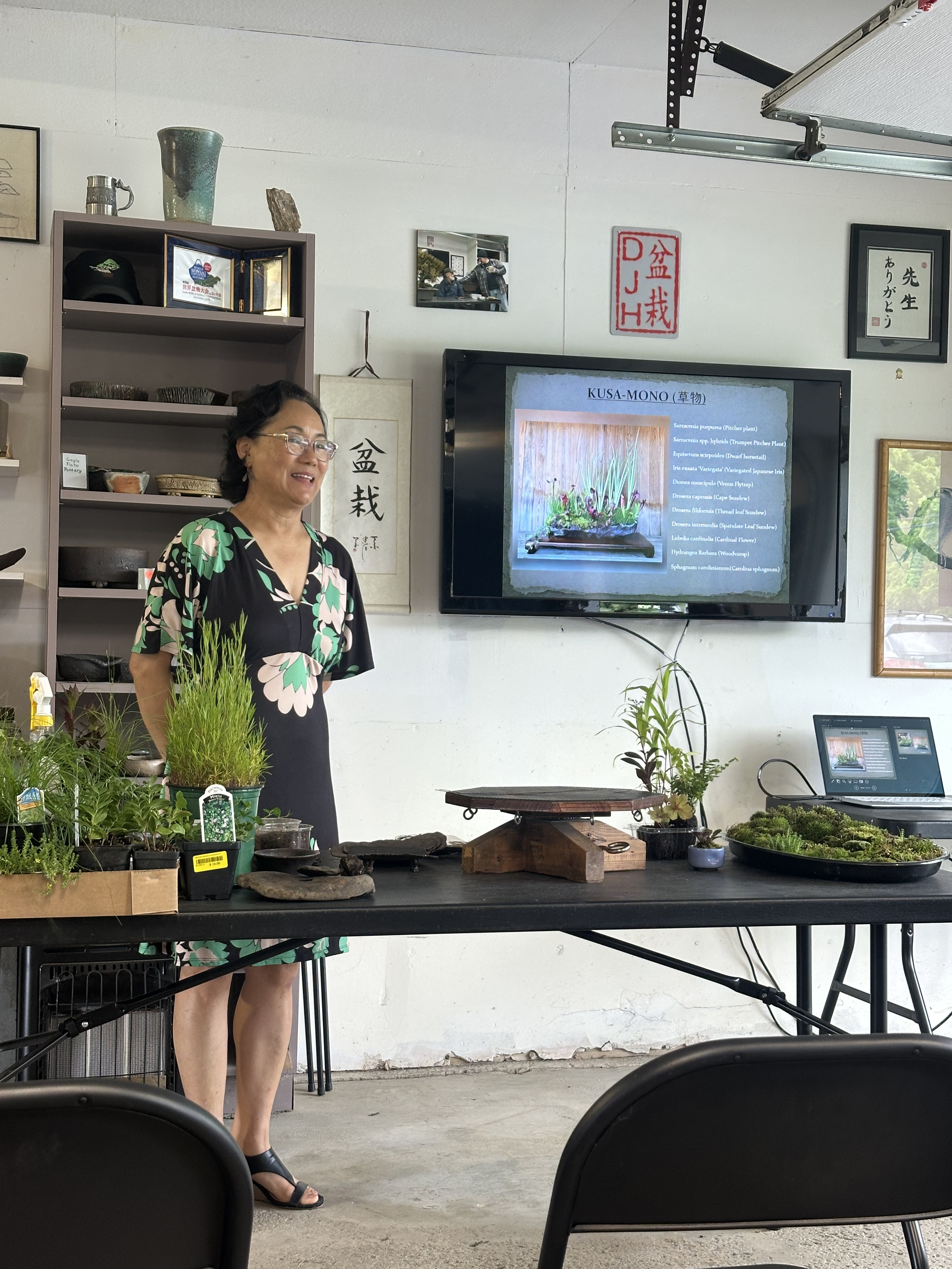 The kusamono education continued on Sunday following our club meeting. Ms. Choe gave a wonderful presentation going much more in depth into types of plants for kusamono, arrangements, and even coordinating plants with seasons. She also spoke about elements of display and went over multiple photos from a variety of shows pointing out both areas of strength and what could be improved.