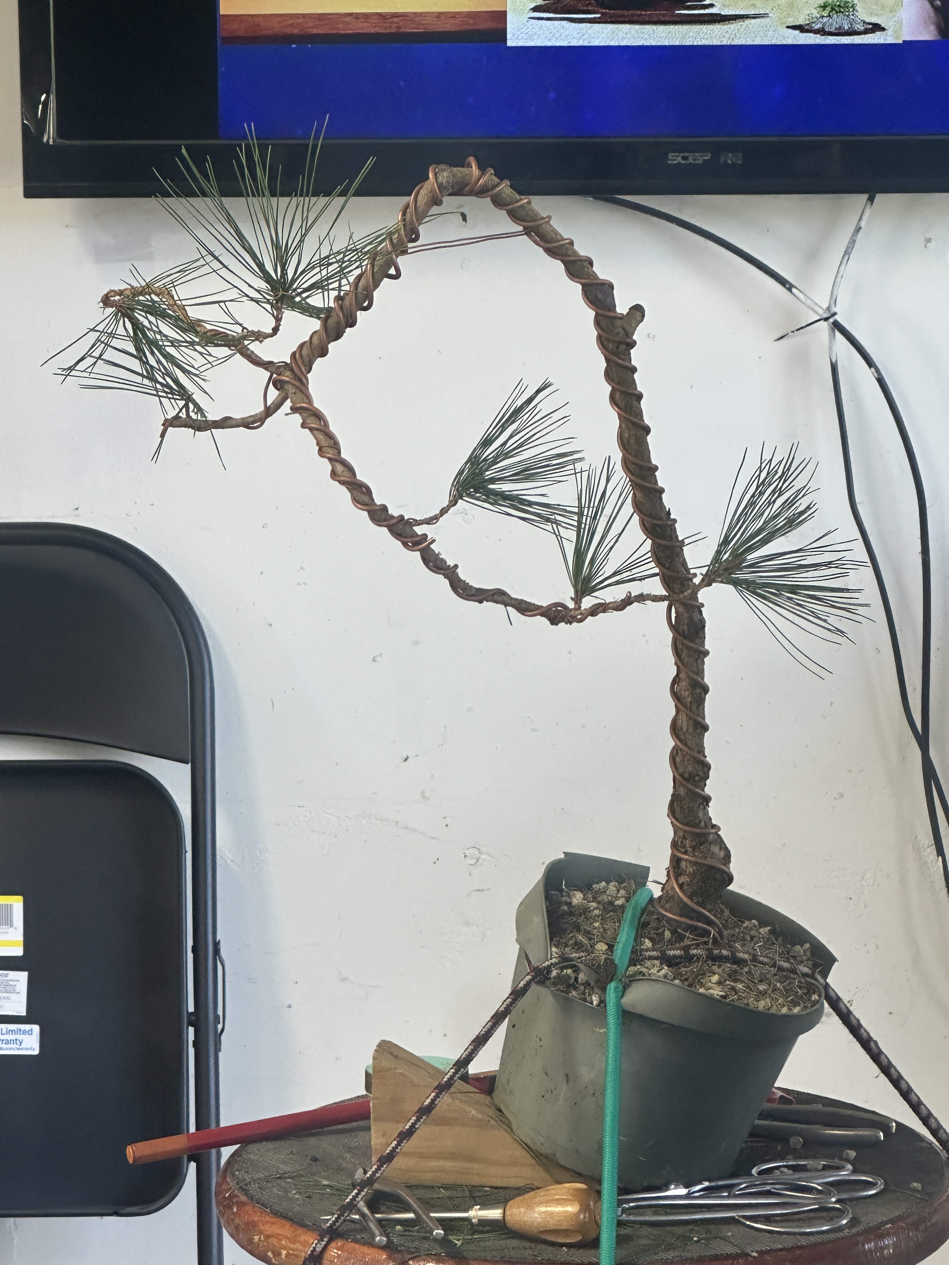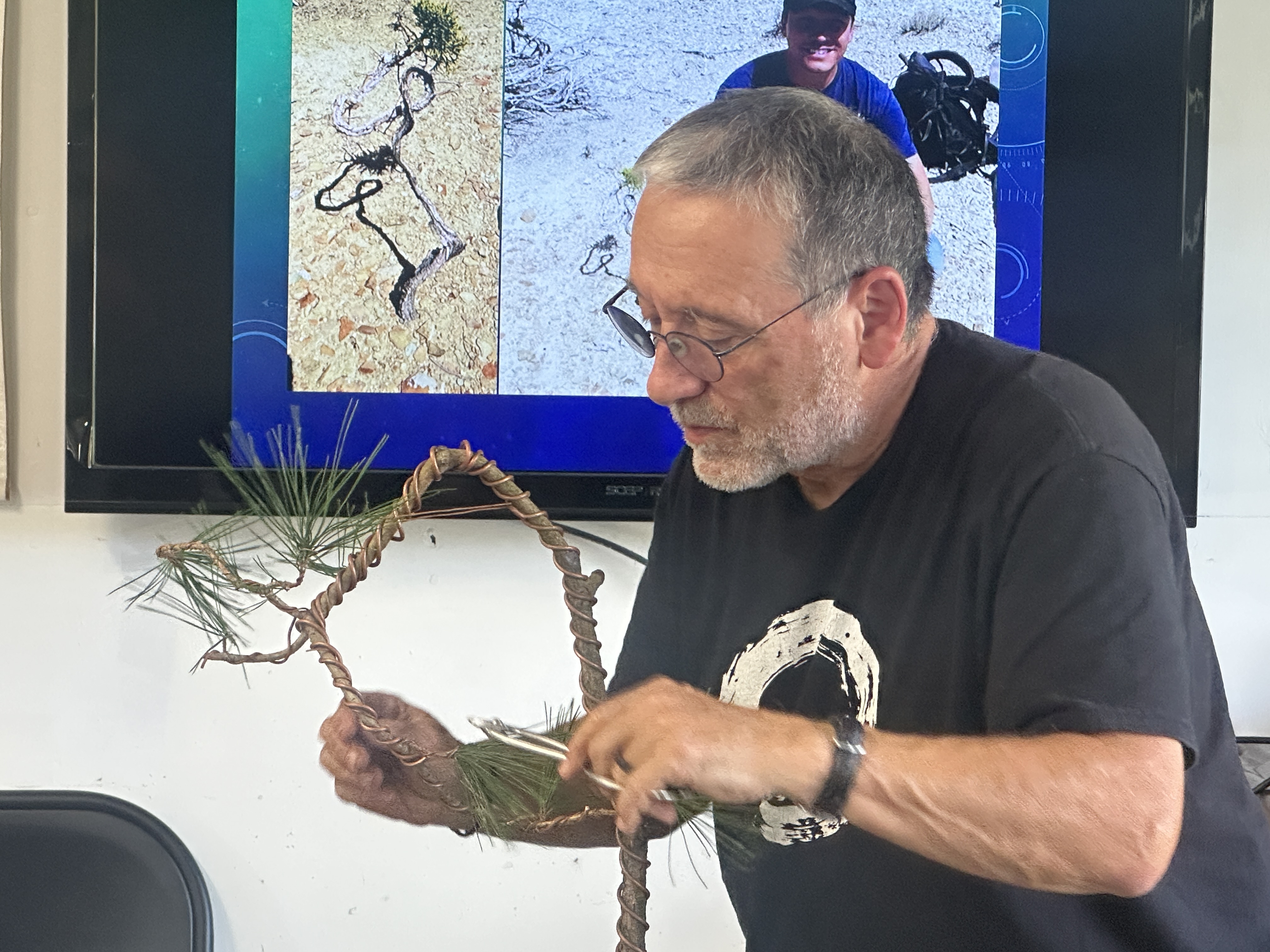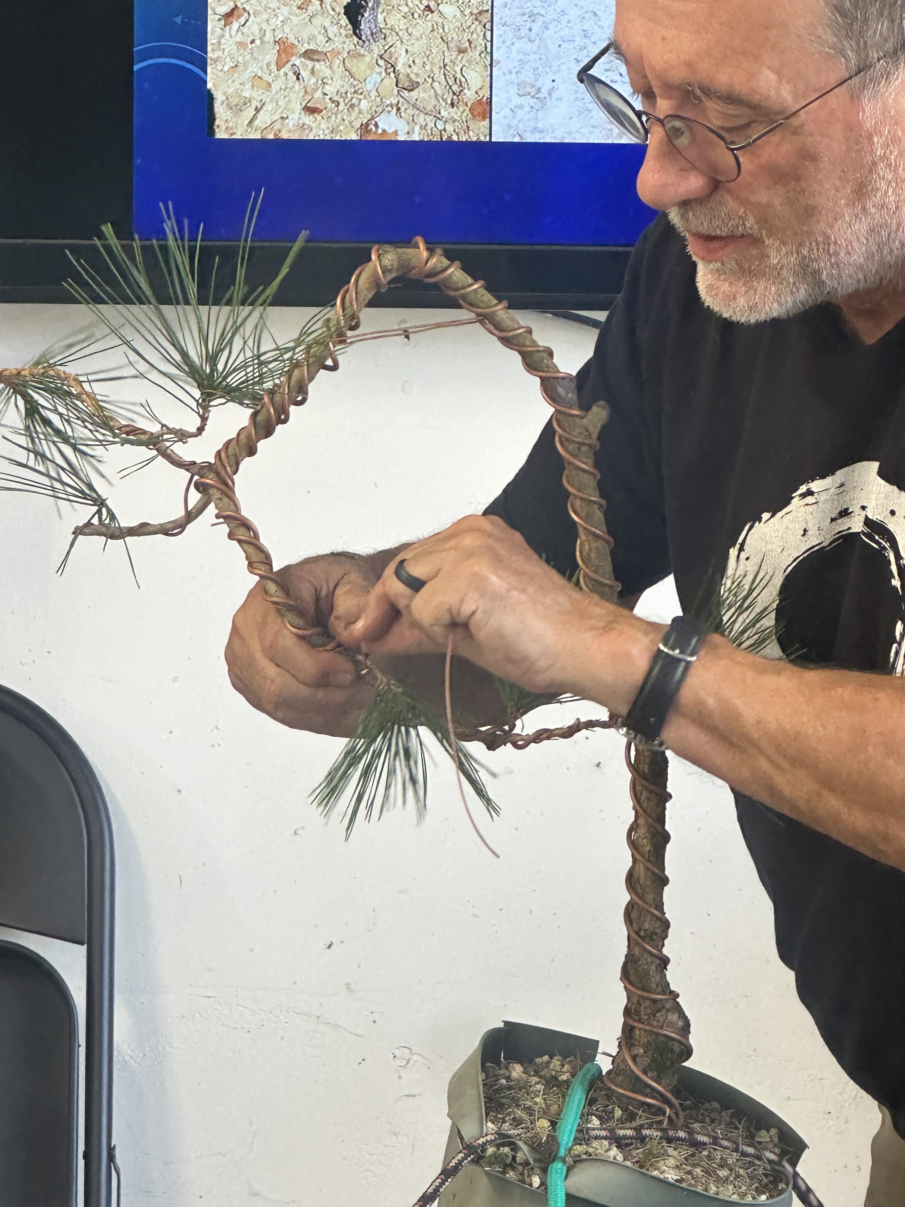 After the presentation, Jon worked on a red pine tree during his demonstration with help from our own David Hodgetts. He applied a double wire for a more severe trunk bend and added a sweep back for his vision of the literati style this tree would grow into.